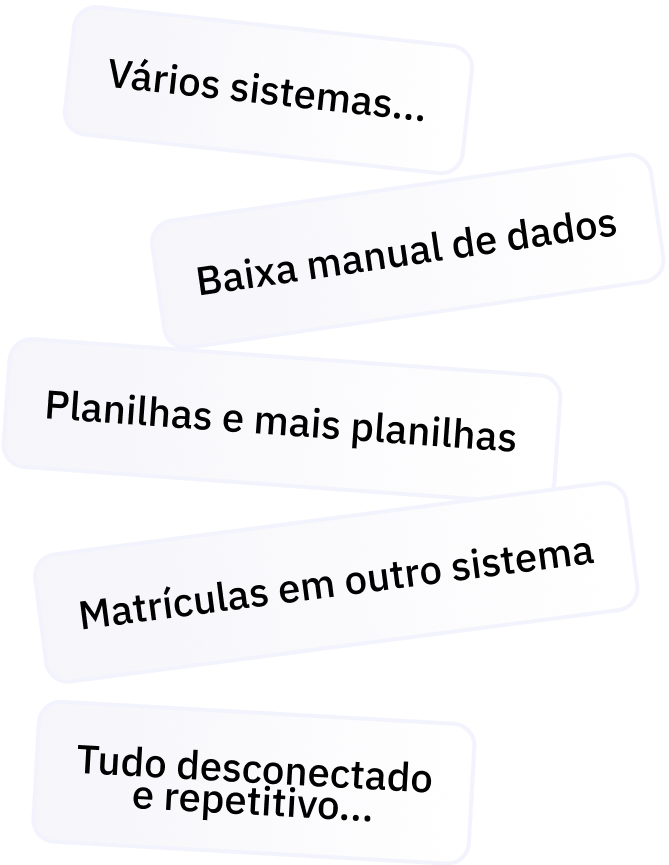 - Processos manuais e conciliação difícil, pagamentos caem em outras plataformas e precisa dar baixa no sistema principal