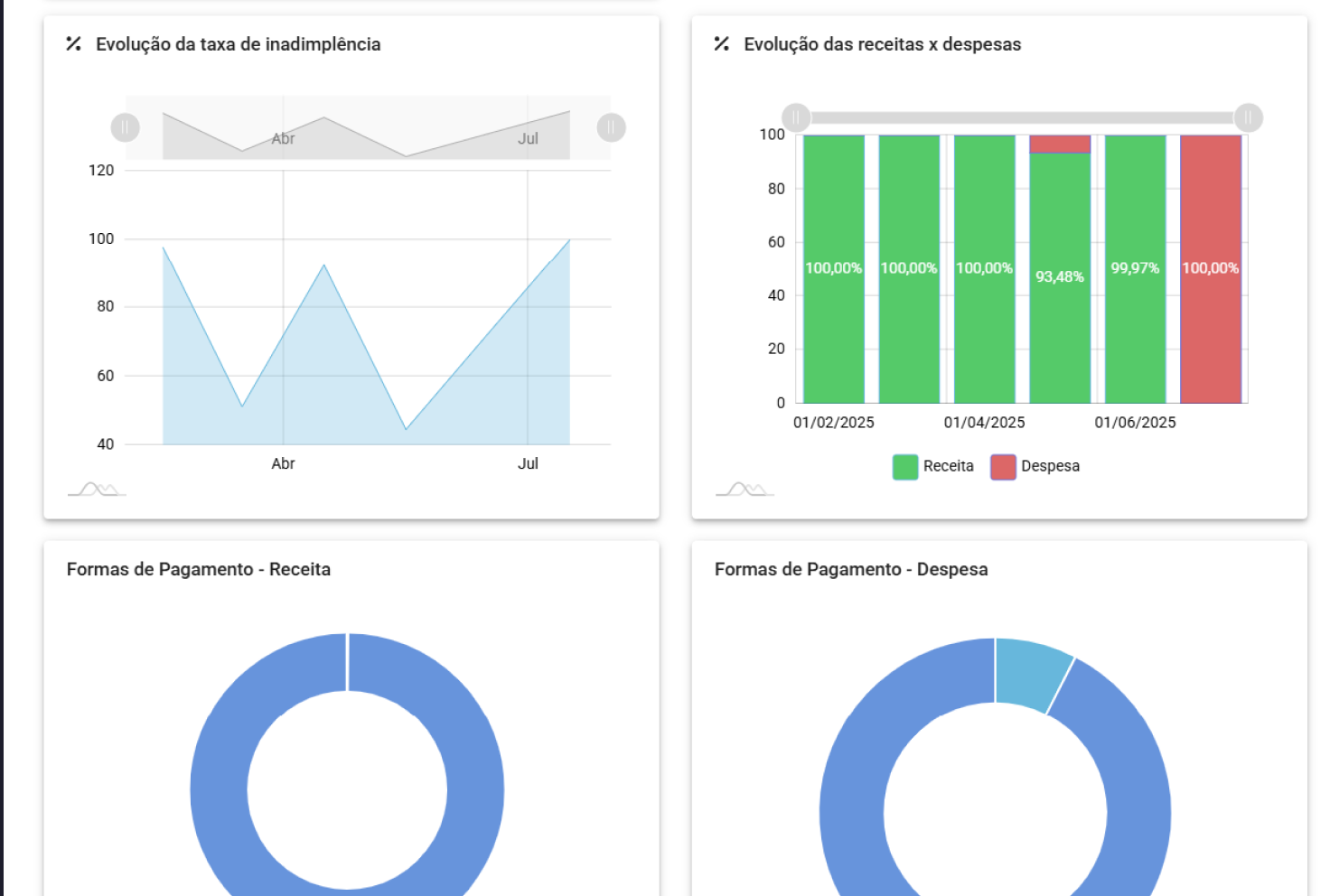 Gestão financeira completa com contrato assinado eletronicamente, renegociações de dívidas e mensagens automáticas de aviso de vencimento e cobrança.